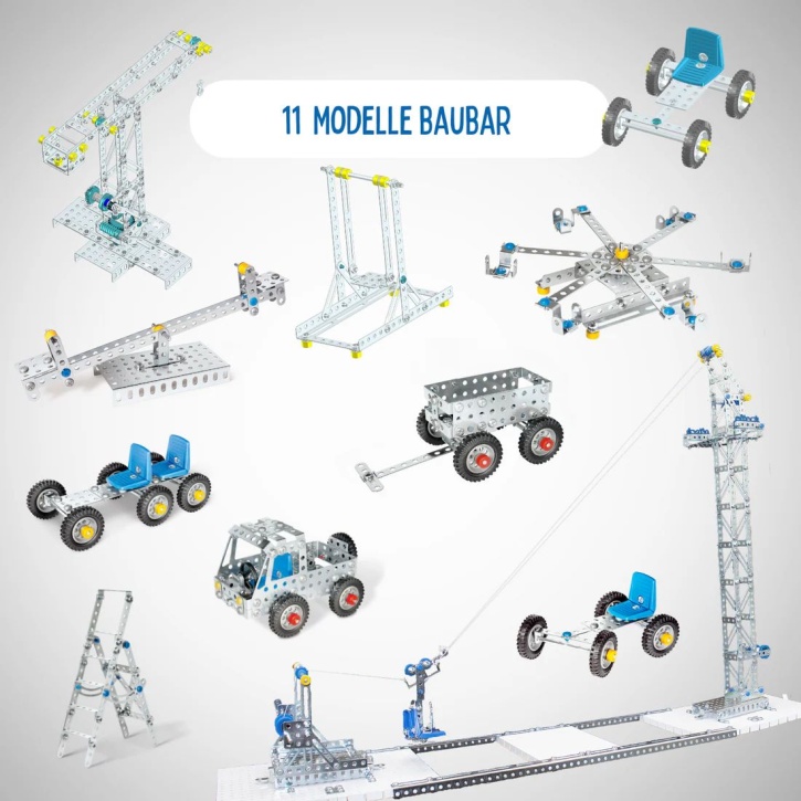- Bau von praxisnahen Modellen, z. B: Seilbahn, Kran, Jeep, Schaukel, Wippe, Leiter und weitere Modelle.