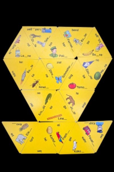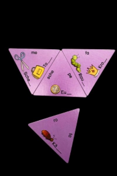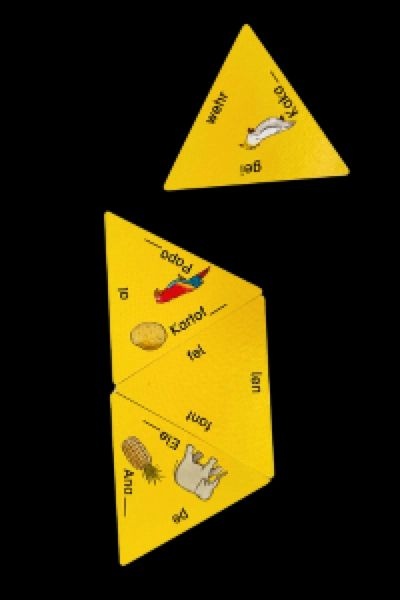 Spiel 2 Dreisilbige Wörter: Die fehlende Silbe in einem Wort mit drei Silben finden. Wortanfang jeweils mit Bild