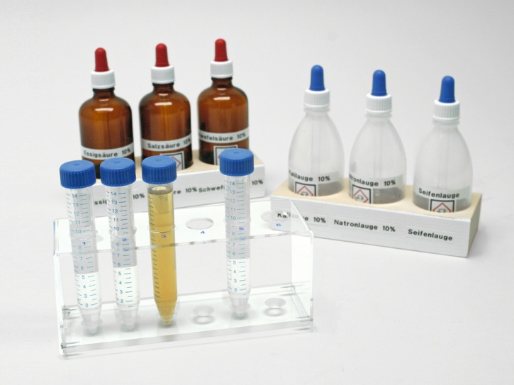 Der Chemie-Schülerversuchssatz ermöglicht die praxisnahe Weiterführung des handlungsorientierten Unterrichts, basierend auf den Konzepten der Schüler-Sets Chemie I und II. Entwickelt in Zusammenarbeit mit Prof. Dr. Andreas Kometz und der Arbeitsgruppe Didaktik der Chemie der Friedrich-Alexander-Universität Erlangen-Nürnberg, deckt der Satz den Themenbereich Säuren, Laugen und Salze ab.