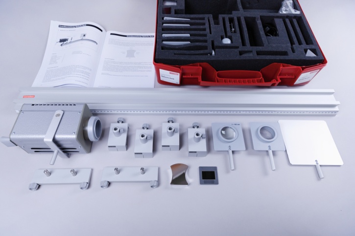 Einzelteile und Materialien: Blenden, Filter, Diapositive, Optikleuchte, Küvette, Linsen, Blenden- und Diahalter, Mattglasscheibe, Schattenkugel, Schirm- und Spiegelhalter, Prismenhalter, Reiter, Planspiegel, Wölbspiegel, Planparallele Platte, Halbzylinder, Prisma